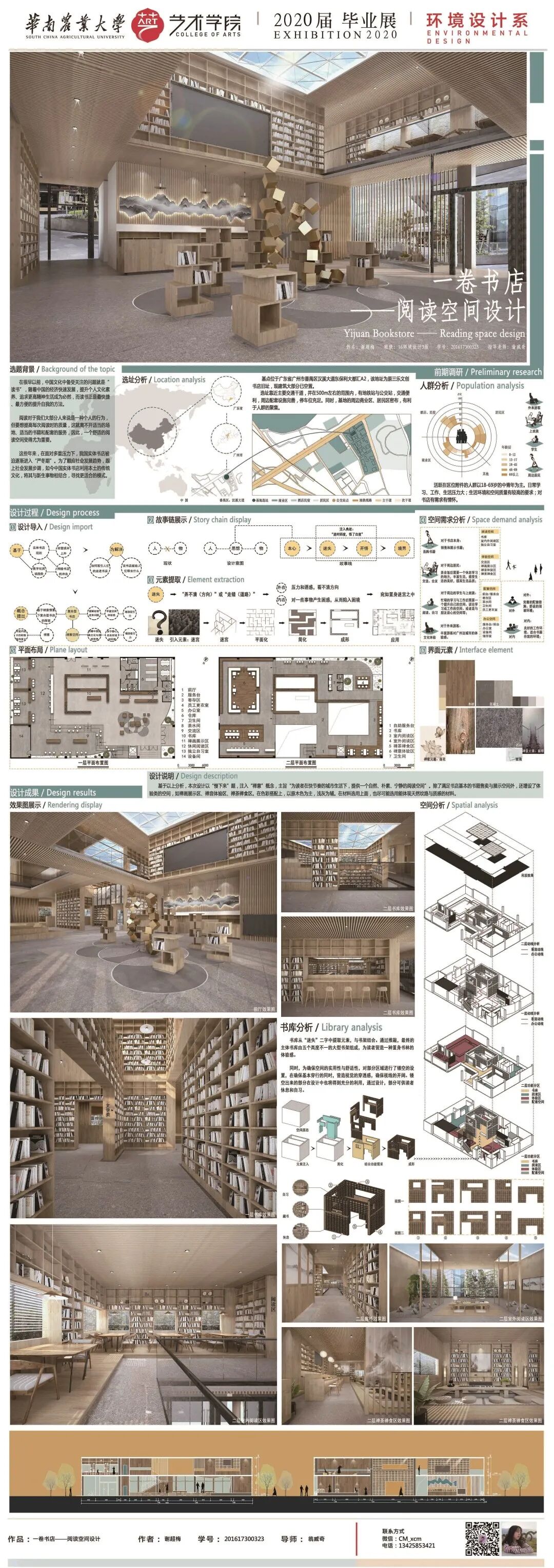 作品简介:对芸芸书舍的空间设计,以“书”为主题,在具备基本功能的前提下,突出书舍特色,做出既符合书舍氛围的设计,又能从中发掘亮点,进行深化设计。
