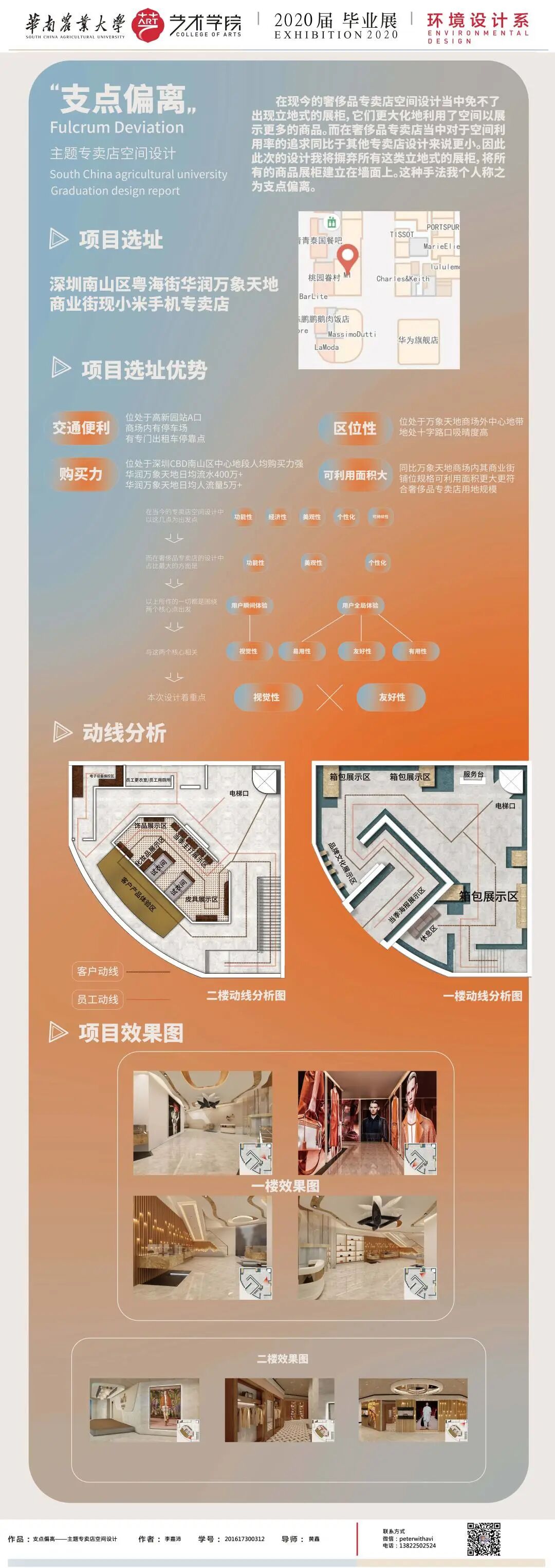 作品简介:现阶段普遍的专卖店空间设计从其功能性、经济性、美观性、个性化、可持续发展性这几个方面着手,而奢侈品专卖店空间设计在美观性和个性化这两方面所作比重会高于市场上其他专卖店空间。用户体验是专卖店设计中的一个重要准则而奢侈品专卖店设计更是将这一环节视为核心,而用户体验又分瞬间体验和全局用户体验这两大部份。显然在奢侈品专卖店中追求有用性和易用性是不现实的,而多数奢侈品专卖店的做法则是提升其友好性以及其视觉性的突出。在现今的奢侈品专卖店空间设计当中免不了出现立地式的展柜,它们更大化地利用了空间以展示更多的商品。而在奢侈品专卖店当中对于空间利用率的追求同比于其他专卖店设计来说更小。因此此次的设计我将摒弃所有这类立地式的展柜,将所有的商品展柜建立在墙面上。这种手法我个人称之为支点偏离。