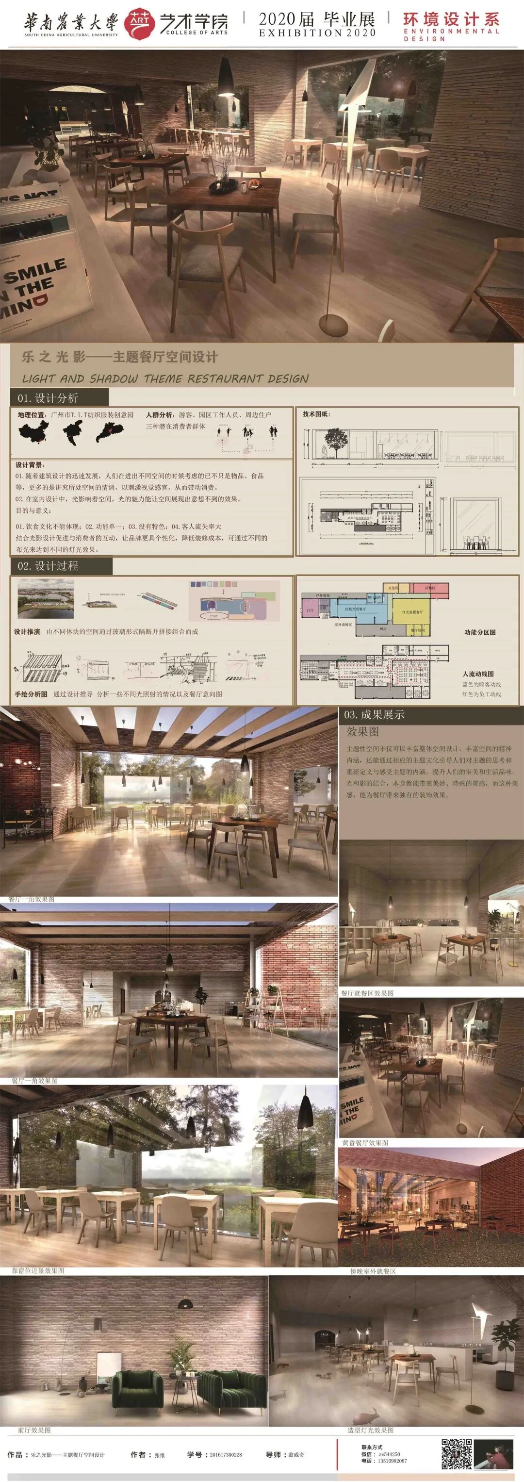 作品简介:光是空间艺术的灵魂,它展现与美化万物的形态,在光的照耀下我们才能感知到万物的形态。仅仅是光的微弱的强度变化就能为空间带来层次感,合理的设计光能增强建筑室内的三维立体感,使得空间更有层次感。光渲染着空间,形成了明与暗,划分了不同空间不同区域的界定。随着各行业的发展,消费观念的不断升级和对生活品质的不断追求,人们对环境的要求也越来越高。通过生活品质提高和光影本身具有研究性两点,将两者结合设计形成一个具有“光影”亮点的主题餐厅,而光影带来的亮点在本设计中的体现为,光影带来的色彩、光影带来的趣味性、光影带来的光照体验与光影带来的装饰等。本文研究的是光影与室内的关系,光影作为主题特色,一种独特的视觉语言,是如何与餐厅文化相互影响、结合并通过创新与设计,从而使室内达到更好的效果。