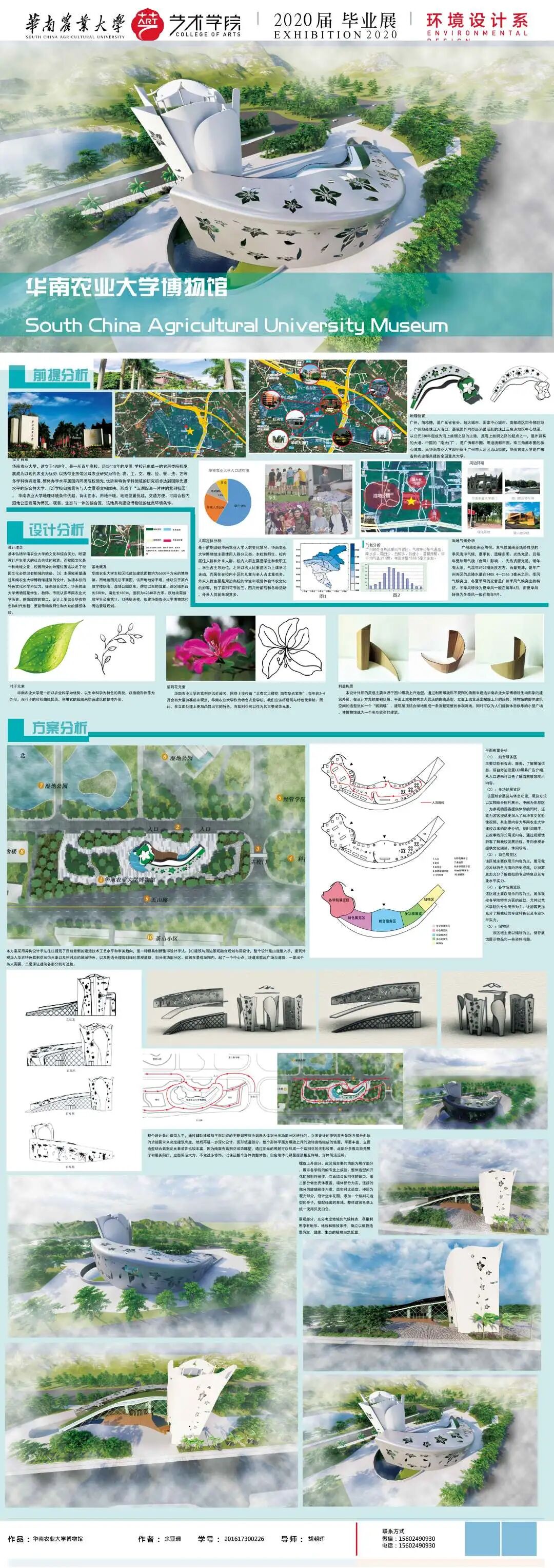 作品简介:博物馆是一个不可忽略的代表着华南农业大学历史文化特色的所在。提供给人的不仅仅是一种物化的汇集与并置,同时也是一种精神性的集聚。博物馆也能在无形中折射出一个学校的精神文化厚度。博物馆收藏的主要为艺术品和各学院的成就展品,而作为华南农业大学特色农业学校,我们应该凸显出它的特别之处,因此在立面处理上都显得比较稳重和特色很突出。博物馆代表了该校的历史、政治、文化经济面貌,在立面处理上特色很突出,或是寓意本学校的历史、文化或是寓意本地环境、特色,题材丰富,风格多样。在空间处理上,根据博物馆的功能要求,各功能空间应有明显区分,展览区应有专门设计的观赏路线加强观赏体验。华南农业大学博物馆是学生、教师、市民认识华南农业大学历史、感悟辉煌的窗口。博物馆,可以领略华农历史文化底蕴,感受生命科学、创新艺术的新华农人文精神。