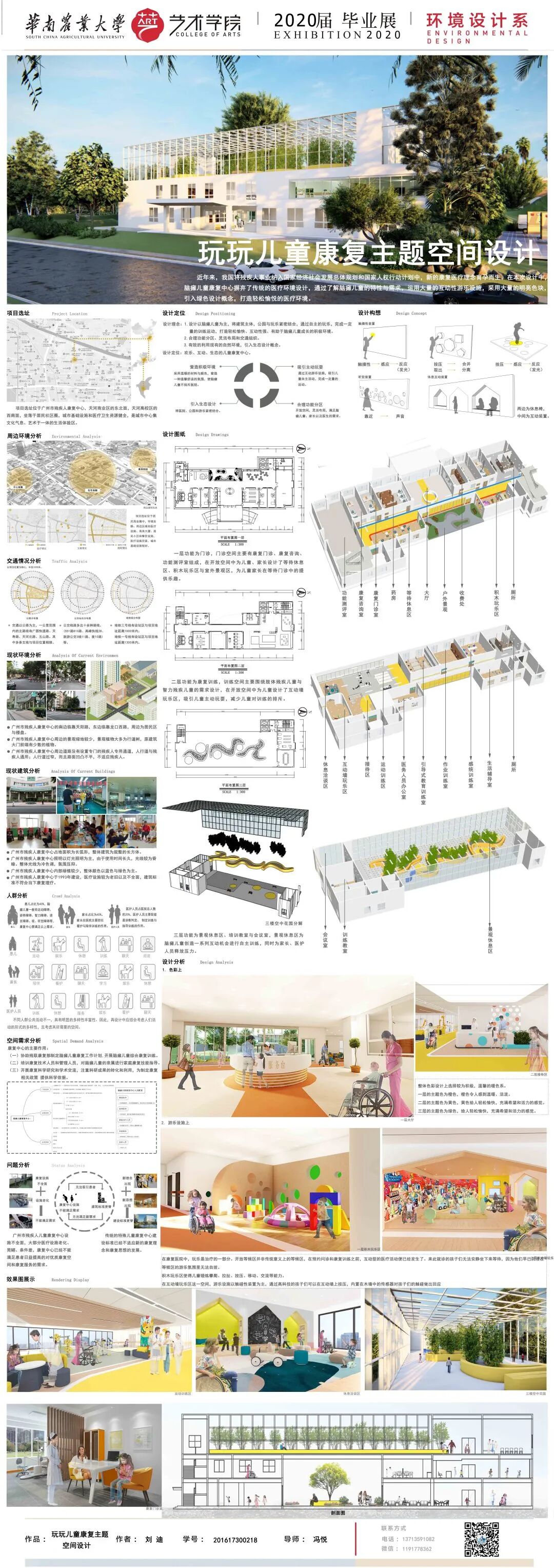 作品简介:近年来,我国将残疾人事业纳入国家经济社会发展总体规划和国家人权行动计划中,新的康复医疗理念育孕而生。在本次设计中,通过了解脑瘫儿童的特性与需求,运用大量的互动性游乐设施,采用大量的明亮色块,引入绿色设计概念,打造轻松愉悦的医疗环境。