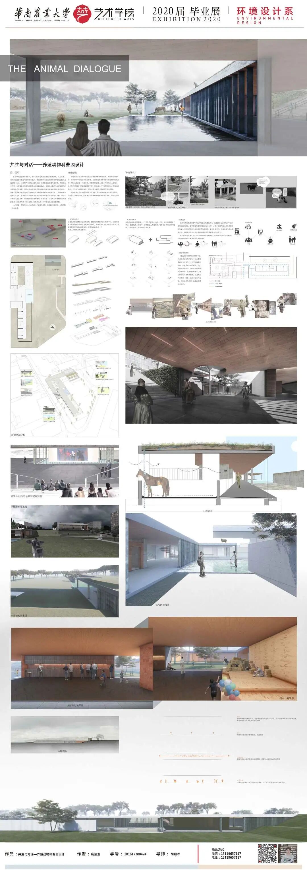 作品简介:整个场地的规划设计运用了可持续的建筑理念,将各个功能分区有机地分散在场地,通过动物的粮食——干草作为景观介入的主题,通过季节性的干草装置展出,将各个功能区串联在一起。在展览流线方面,作者节选了养殖动物的某一生产环节,通过单一的流线设计和体验式展示方式,使人们在该园区内能由衷地感受与认识到养殖动物的魅力与生活习性,在空间组织中,设计的虽然是一个园区的规划,但是场地整体却不做封闭的围合,通过开放的空间规划,把更多的潜在人群吸引到场地来。作者的设计初衷就是希望提供一个场所,人们可以自发性地进入场地,参与其中或自发性地举行各种行为活动,以达到提升与场地内的养殖动物接触率,唤醒人们对自然的亲密感以及提升对养殖动物的认知度的效果。