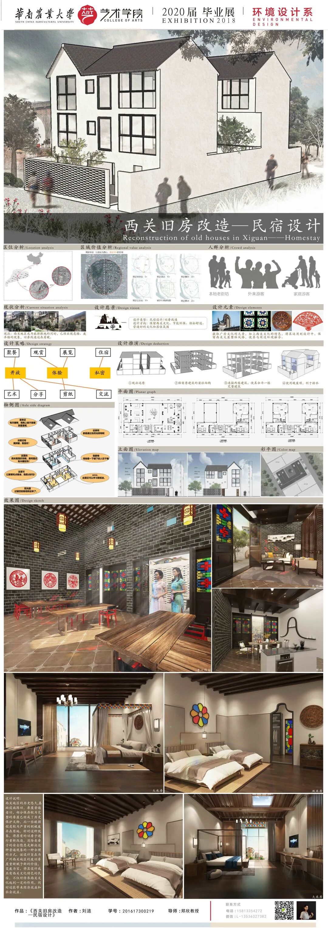 作品简介:西关地区的历史悠久。房屋普遍老旧,部分保存较为完整的房屋已经成了历史保护文物,而一些破损程度较为严重的则被废弃在那里,该设计旨在为广州西关地区的废旧房屋赋予新的价值,变废为宝,将其设计成具有西关文化特色的民宿,使其能带来经济效益和社会效益。