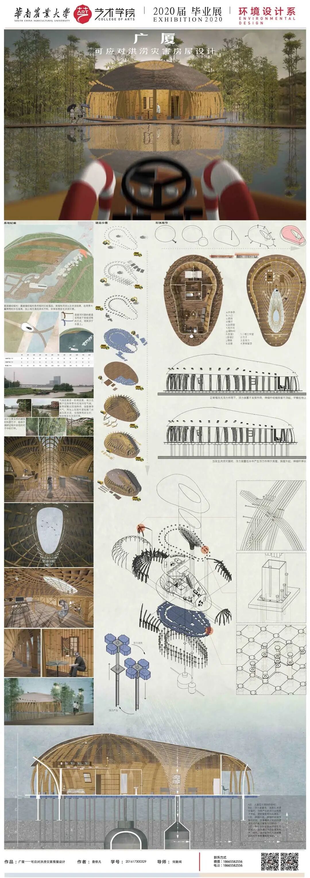 作品简介:“广厦”取自杜甫《茅屋为秋风所破歌》“安得广厦千万间,大庇天下寒士俱欢颜”,“广厦”是杜甫愿景里能够使天下贫寒疾苦的人都能安身立命的避难所。这里用“广厦”寓意一个在灾害发生时能起到避难功能的避难所,能成为居民的“广厦”。全球受洪涝灾难影响最大的国家之一——中国,中国80%的耕地面积和三分之二的国土面积受到洪涝灾害的影响。以广州市南沙区黄阁镇为项目所在地,设计一个符合可持续发展的可应对灾害的房屋,降低在灾害中发生风险的概率,减少在发生灾害时居民的财产损失,并满足居民的日常生活,尽量减少灾害对居民的影响。
