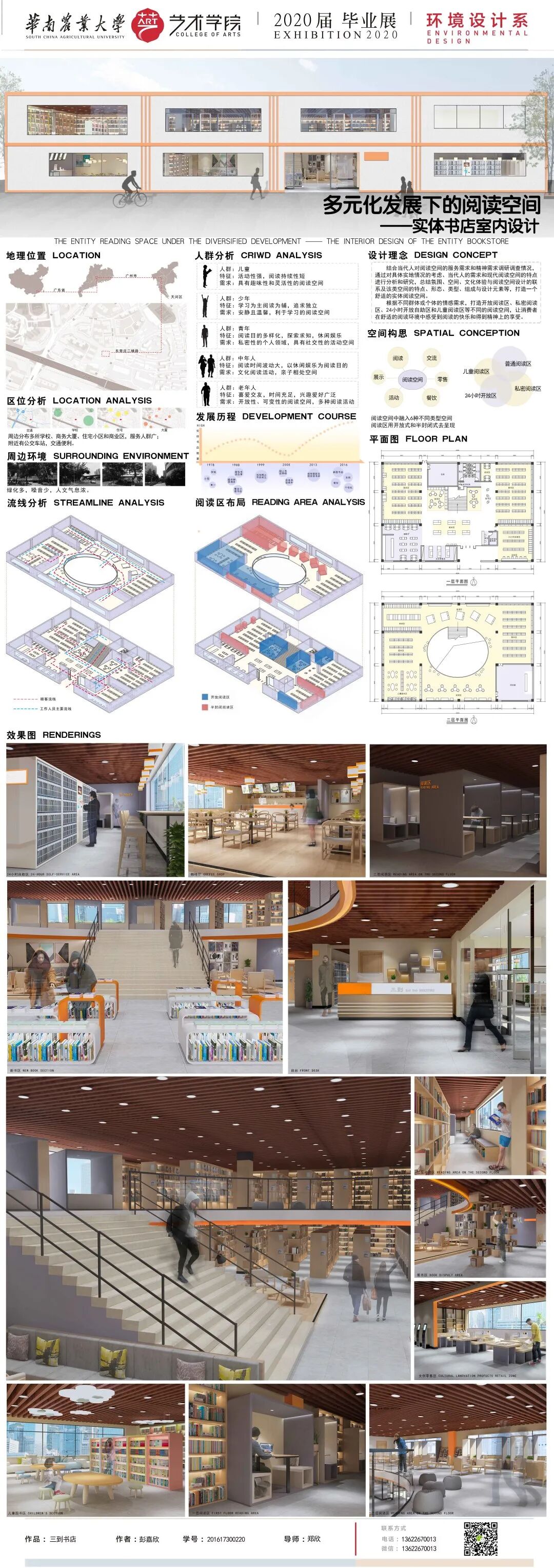 作品简介:本设计通过对不同年龄人群的不同阅读空间需求,打造一个能满足大众需求的实体阅读空间。模拟解决多元业态结合的新型阅读空间存在的问题,让阅读空间的设计回归于阅读本身,打造一个人与人、人与书、人与书店的文化生活空间,让读者在阅读空间中找到归属感,在阅读中获得精神上的满足感。