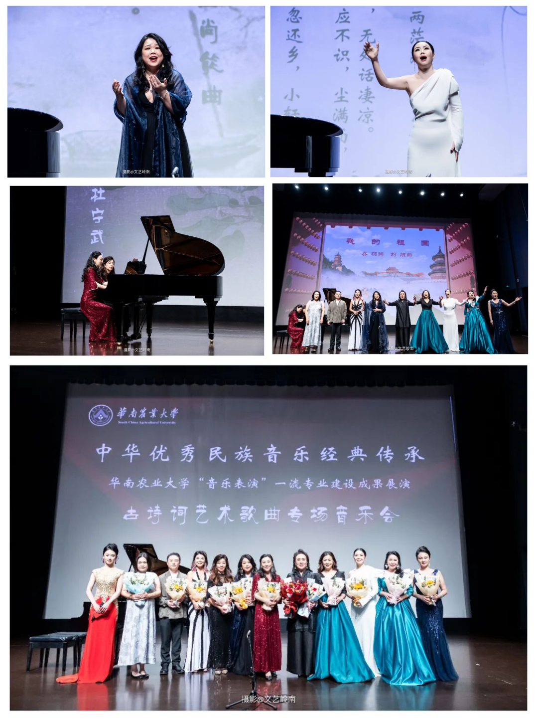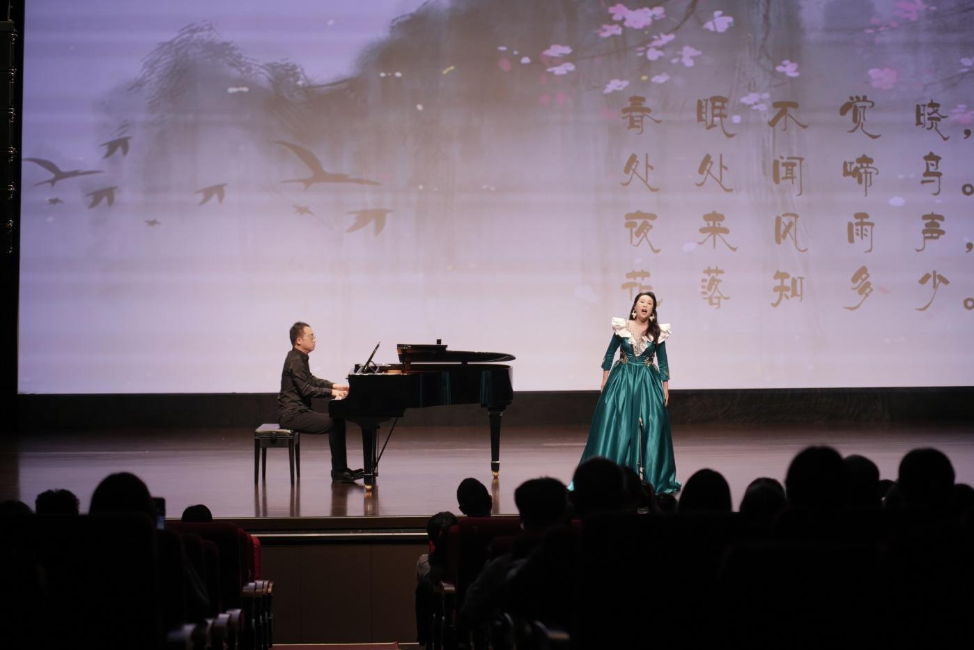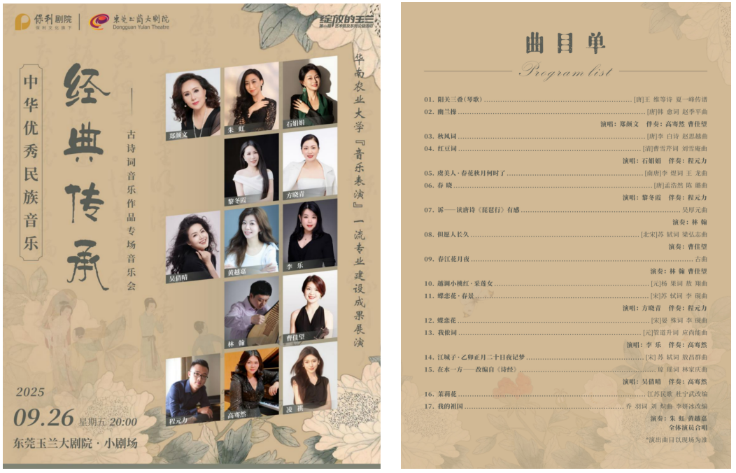 在浩瀚的中华文化星空中,古诗词与音乐艺术始终交相辉映,谱写出千年不绝的回响。中国古诗词艺术歌曲,蕴含中国传统文化的思想深度、情感浓度和历史的厚重感,完美融合了古典诗词深邃的文学意境与音乐创作精湛的艺术魅力,具有意象与意境之美、比喻与象征之美、格式与音韵之美等多重美学特征,是文学与音乐的双重遗产,代表着中华美学的至高境界,呈现出独具东方神韵的艺术表达。2025年9月26日晚,华南农业大学艺术学院“诗韵千年·乐动古今”中华优秀民族音乐经典传承——古诗词艺术歌曲专场音乐会在东莞玉兰大剧院成功举办。