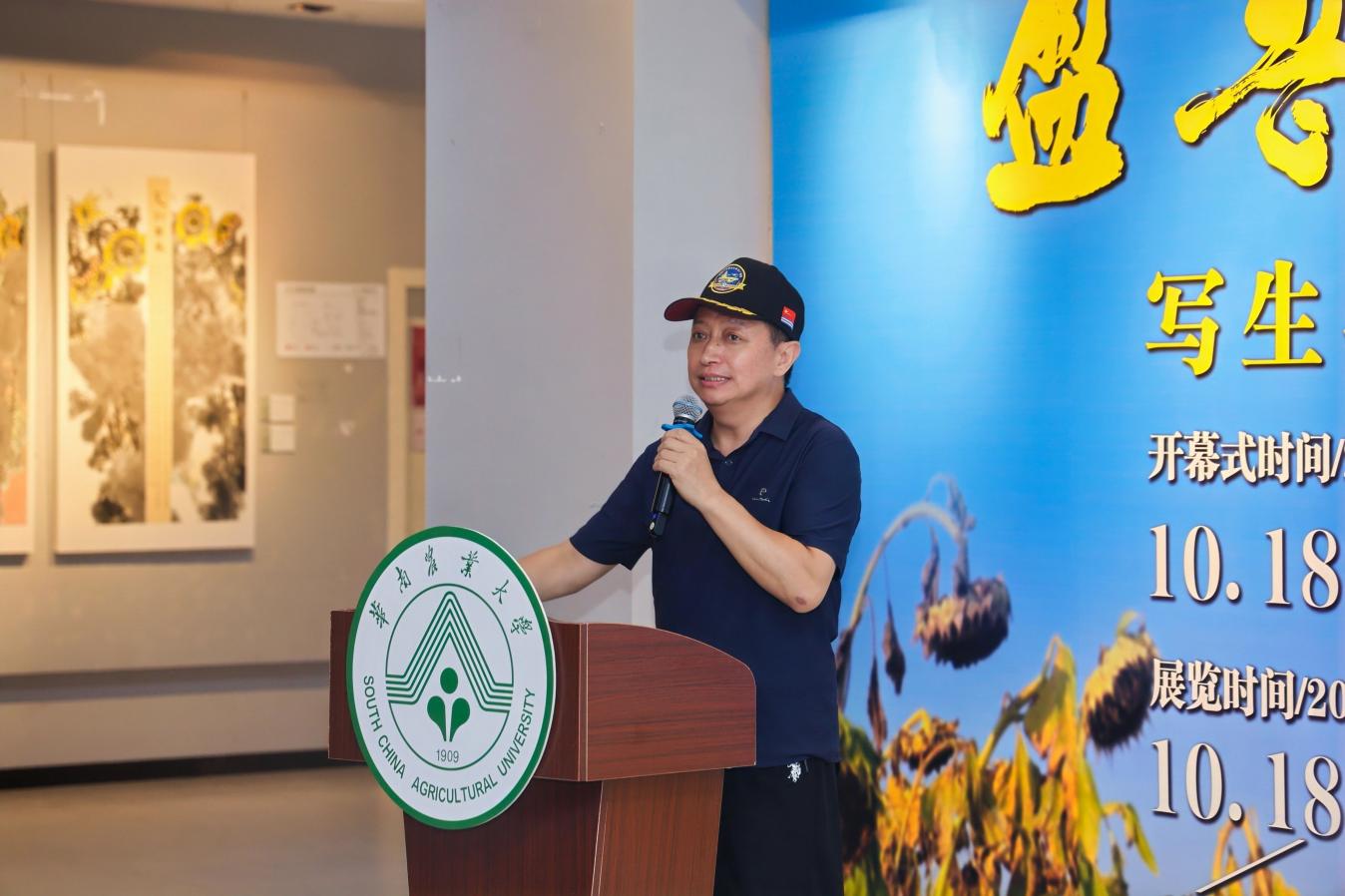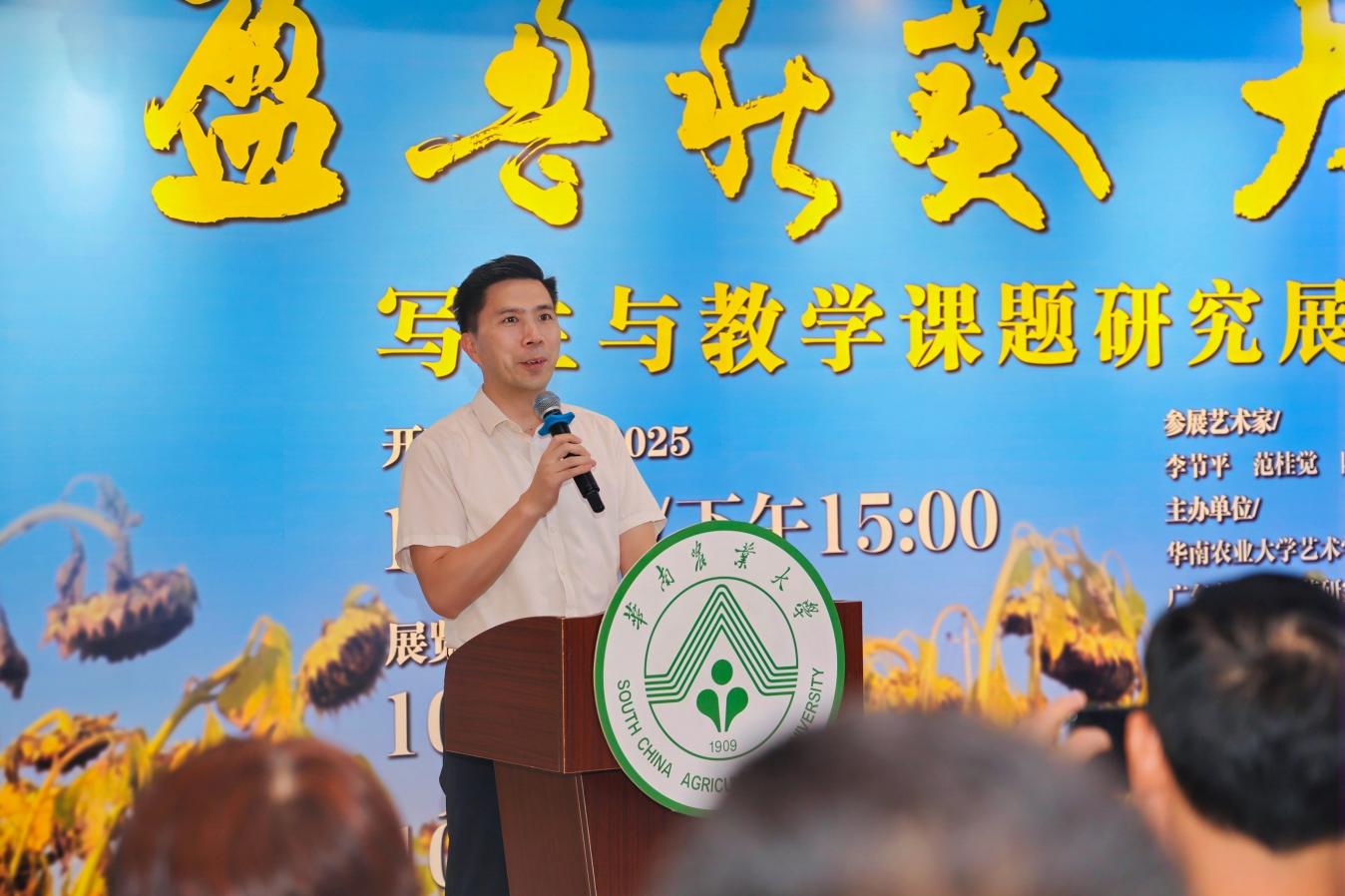 华南农业大学艺术学院执行院长张艳河在致辞中指出,本次展览具有三重意义:一是“以美育人、以文化人”,将“修德、博学、求实、创新”的校训转化为可观可悟的美育现场;二是推动“艺术+农学”跨界融合,通过内蒙古和林格尔县写生实践,将向日葵意象与学校服务“三农”的使命紧密结合;三是完善协同育人体系,以“课程—实践—平台”联动促进“全员、全程、全方位”育人机制建设。他强调,本次展览不仅是艺术学院实践育人模式的重要体现,也是学院推动艺术教育融入校园文化、服务社会发展的生动实践。
