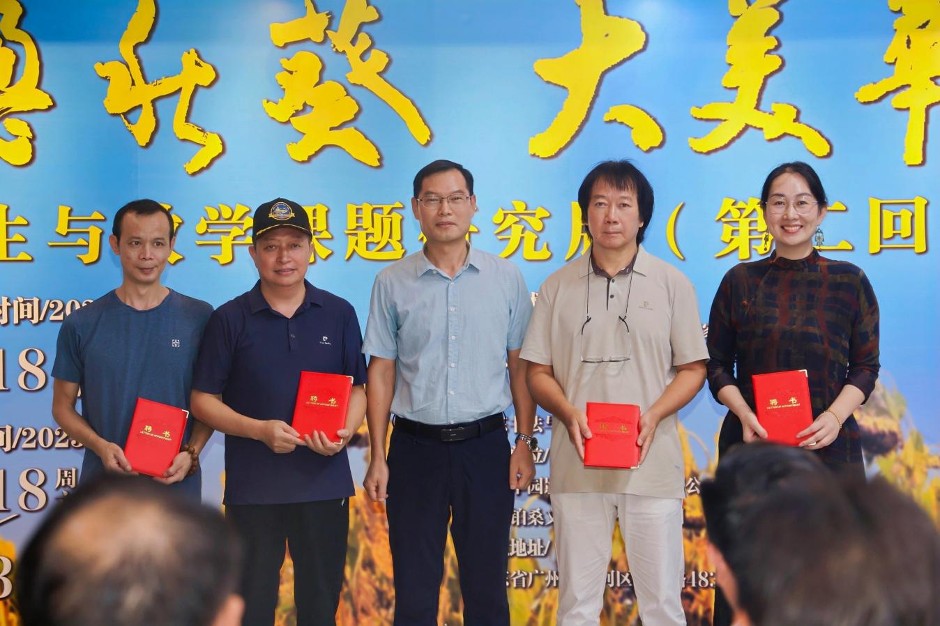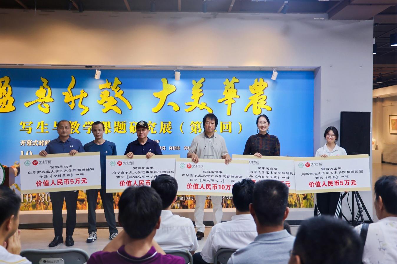 开幕式上举行了作品捐赠仪式,多位艺术家向华南农业大学艺术学院捐赠作品,艺术学院副院长谢云辉代表学院接受捐赠。随后,学院党委副书记房三虎为艺术家颁发艺术学院客座教授聘书,并感谢他们对学校艺术教育事业的支持与贡献。