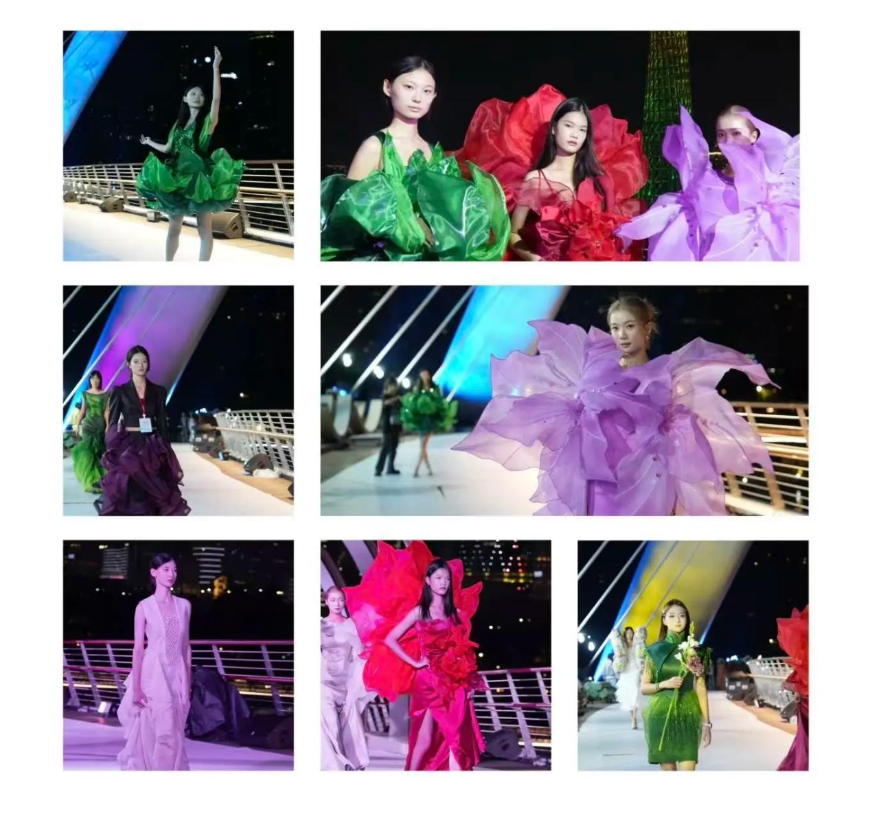 当晚,以“织梦”为主题的时尚大秀在珠江之畔绽放异彩。《千年织梦》以粤韵与帆影演绎港口文明,《三花烂漫》以时尚造型展现湾区活力,英歌舞与醒狮表演的加入点燃全运激情。面对海心桥桥体狭长、地面不平、动线受限等复杂条件,艺术学院团队通过精确到秒的节奏控制和1:1实地彩排,确保整场演出安全流畅、精彩呈现。