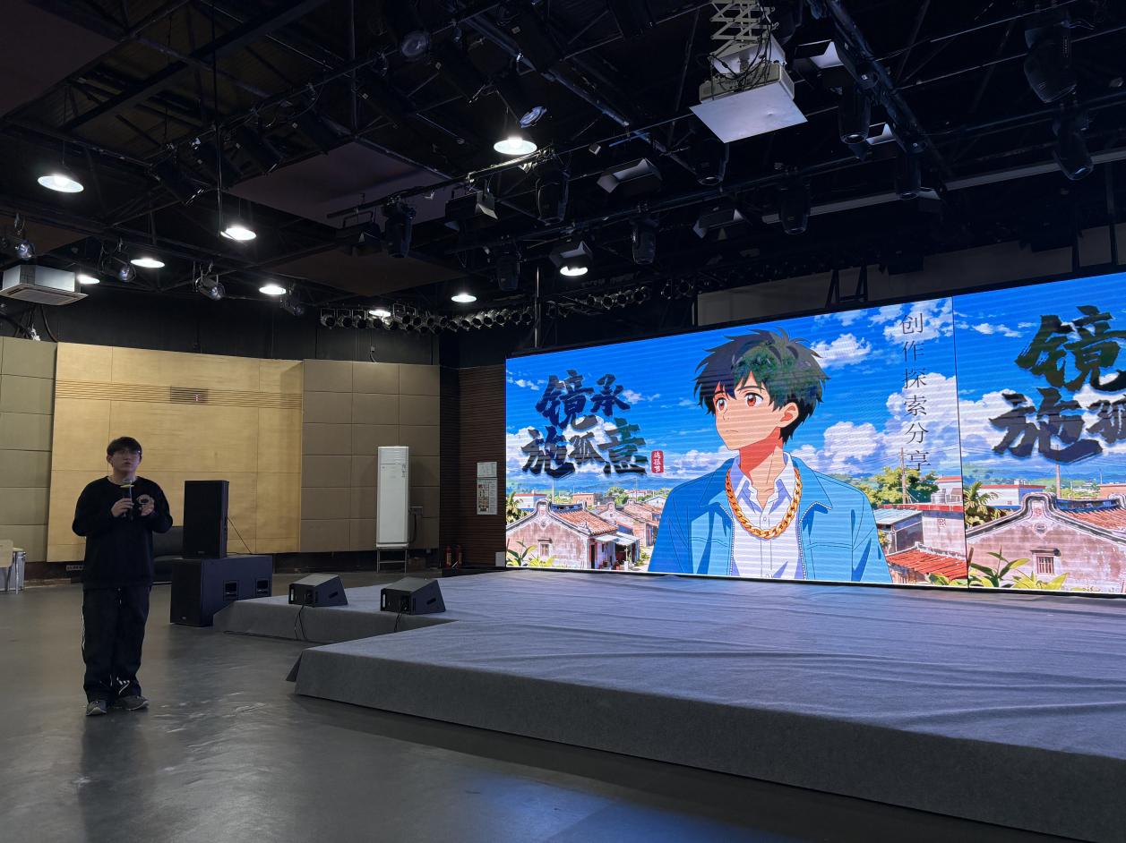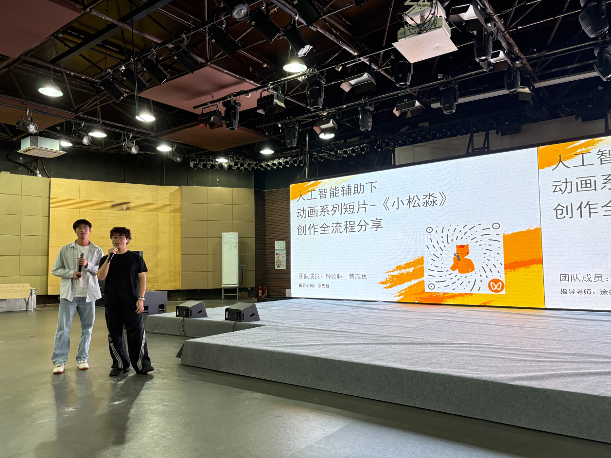 研究生张永婕、本科生钟德轩与曾志民团队、陈海涛团队先后结合各自的创作实践进行了主题分享与案例展示。张永婕结合自身创作实践,作了题为《从原创角色到智能动画的技术新路径——以“百合佼佼”为例》的案例分享。她以江门开平市百合镇文旅IP“百合佼佼”为研究对象,展示了AI技术在原创角色设计、实拍与三维动画生成及叙事扩展中的创新应用,为地方文化数字化转译提供了新思路。钟德轩、曾志民团队分享了原创动画IP案例《小松淼》,并以“人工智能辅助下的系列短片创作全流程”为主题,分享了从角色设定、分镜脚本到动作生成的AI协同创作全过程,探索了AI与人工创作相结合的多样可能。陈海涛团队带来了实验动画短片《镜承施孤意》的AI动画创作案例汇报,从视觉语言、情感生成与叙事逻辑三方面阐释了AI在艺术化表达中的潜能与挑战,呈现了青年创作者的探索精神与技术敏感度。