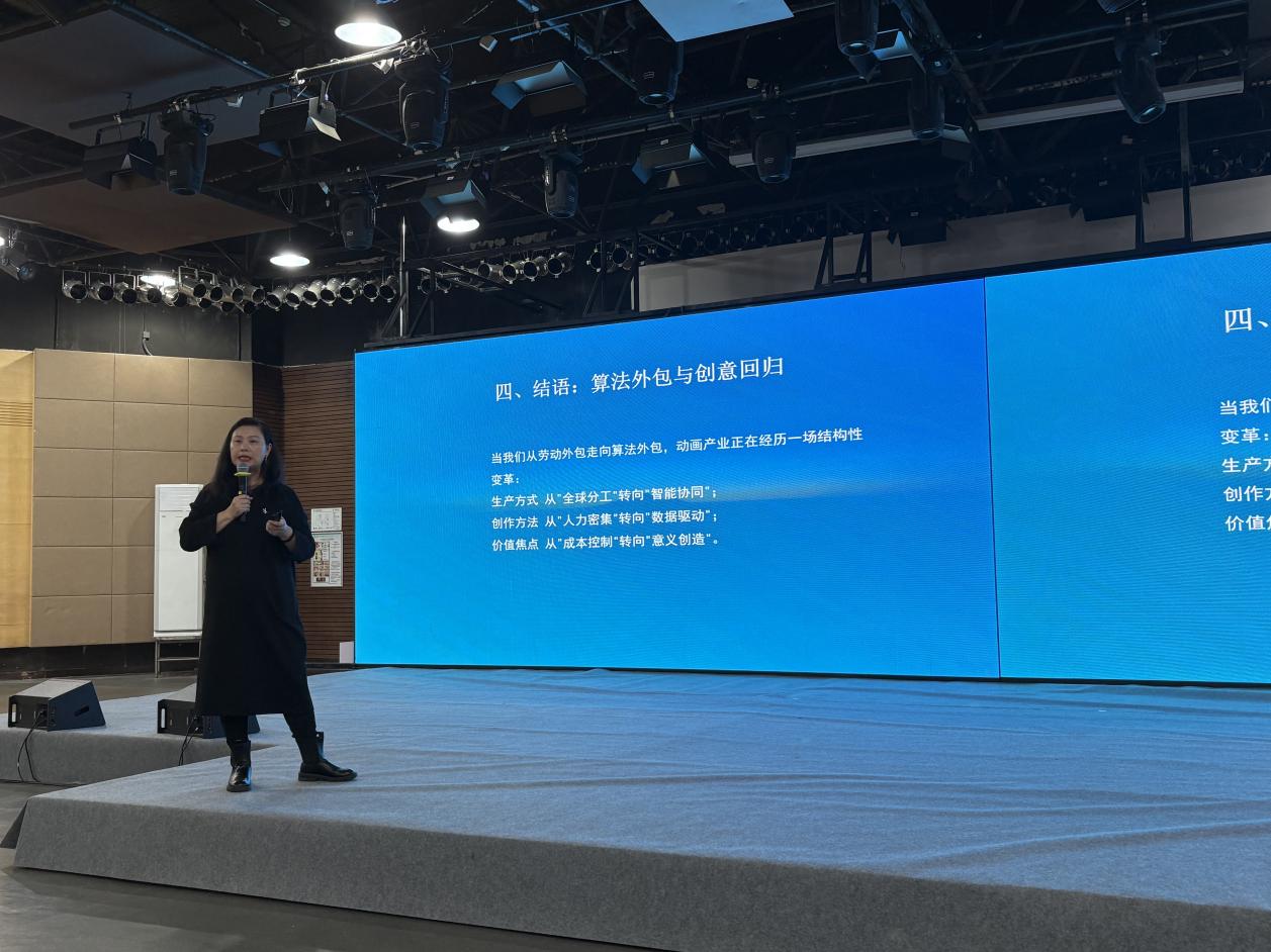 随后,涂先智主持并作了题为“从劳动外包到算法外包:人工智能时代的动画创作方法变革”的专题报告。讲座聚焦人工智能技术在动画创作领域的前沿应用与深层变革,探讨AI如何重塑动画的生产方式、创作逻辑与产业生态。她指出,人工智能的介入不仅提升了创作效率,更推动动画创作方法从“劳动外包”向“算法外包”转型。 同时,她呼吁创作者在拥抱新技术的过程中,坚持原创精神与人文表达,守住动画艺术的思想温度与情感根基。