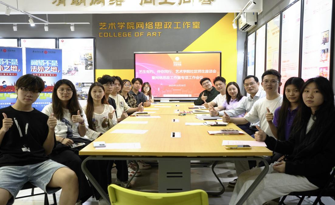 2025年10月30日上午,我院在启林南思创园召开“艺生有约,伴你同行”艺术学院社区师生座谈会暨网络思政工作室建设情况专题会议。学院党委书记施娜柯、辅导员刘志鹏、林香润及相关学生组织、学生工作室骨干代表参加。会议由学院党委副书记房三虎主持。