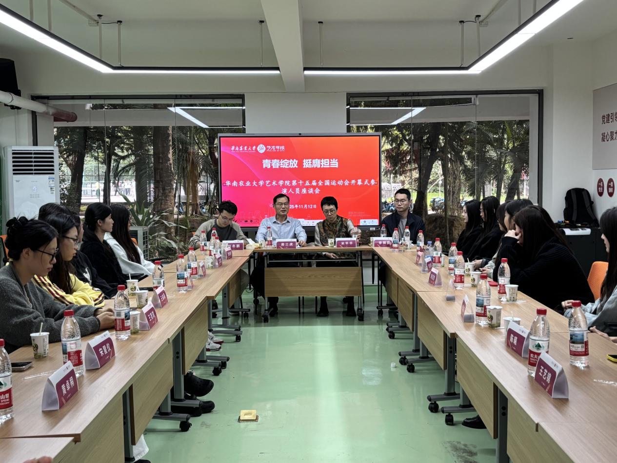11月12日,华南农业大学艺术学院在启林北一站式社区服务中心党团活动室举办了一场温情满溢的座谈会,28名参与第十五届全运会开幕式引导员工作的艺术学子受邀到场,分享幕后训练的汗水与逐光而行的成长感悟。学院党委副书记房三虎、表演系主任米平平、学工办主任刘志鹏、辅导员李狮弧出席座谈,与学生们亲切互动。