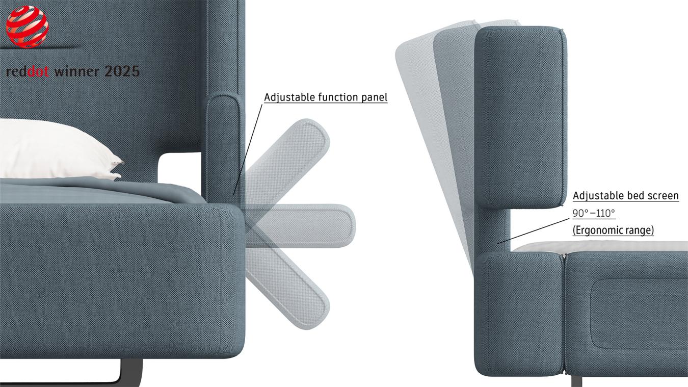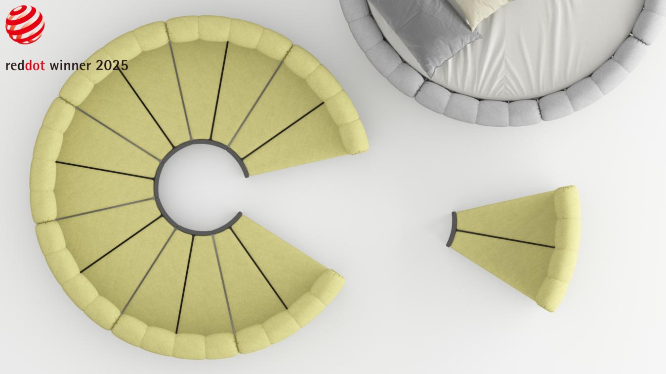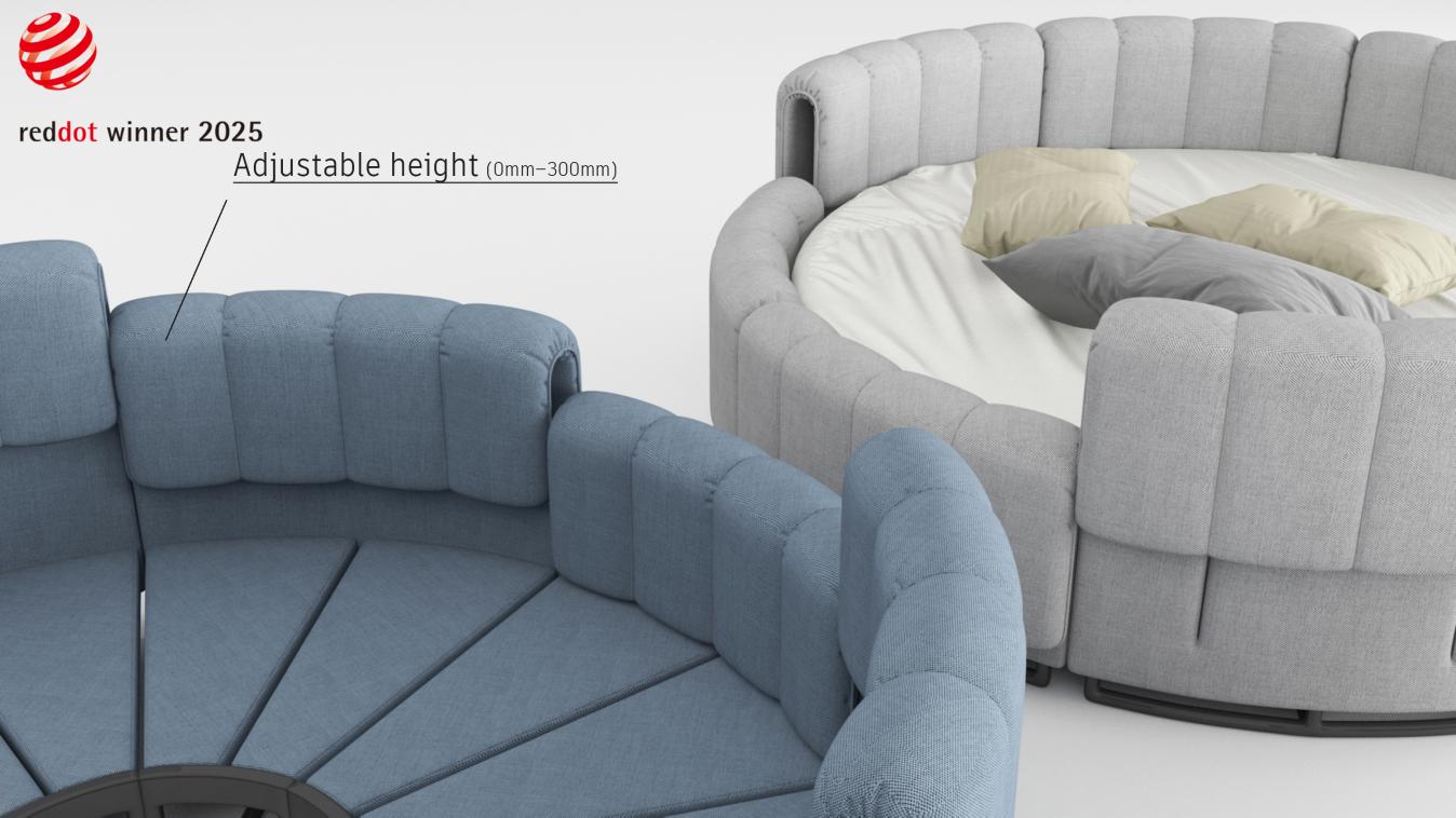 设计说明:Petal Bed以花瓣为设计灵感,采用模块化圆床结构,由八个相同模块组装而成,零部件可拆装、回收、替换,有效降低生产环节的物质消耗。其靠背具备升降功能,适配图书馆、户外休闲等多场景,围合式设计更利于拉近人际距离、促进交流。在材质选择上,作品采用植物纤维布料与再生金属,深度践行可持续设计理念。