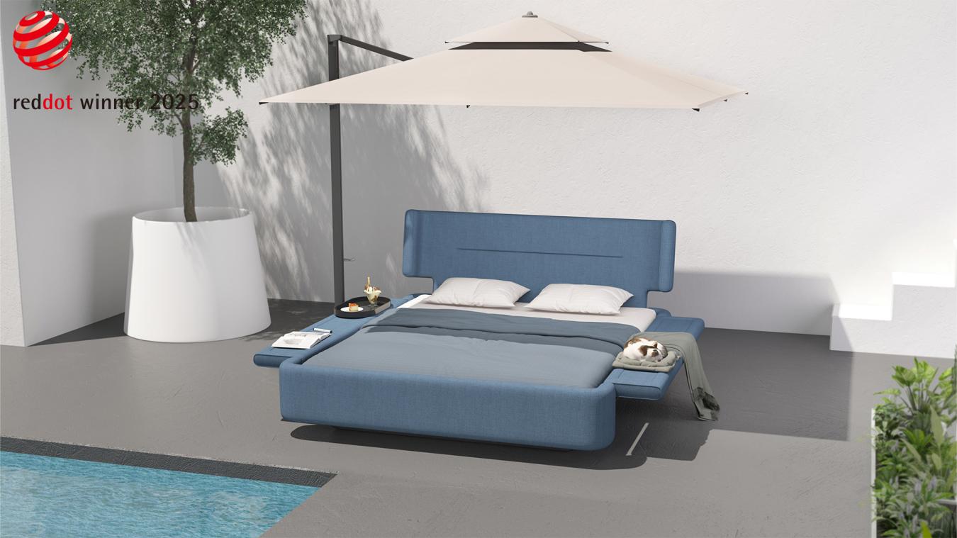 设计说明:Whale Bed的设计灵感来源于鲸鱼。后疫情时代户外休闲需求升级,作品精准契合市场趋势,通过简约外观设计减少材料消耗,同时融入多功能创新:床屏可像鲸鱼尾巴般摆动调节角度,适配不同坐卧姿势;床架两侧的鳍状功能板既可放置物品,也能作为宠物休憩空间。环保植物纤维面料的运用,使其兼顾室内外使用场景,适配庭院、泳池等休闲场所。该作品源自华农与慕思股份的产学研合作。