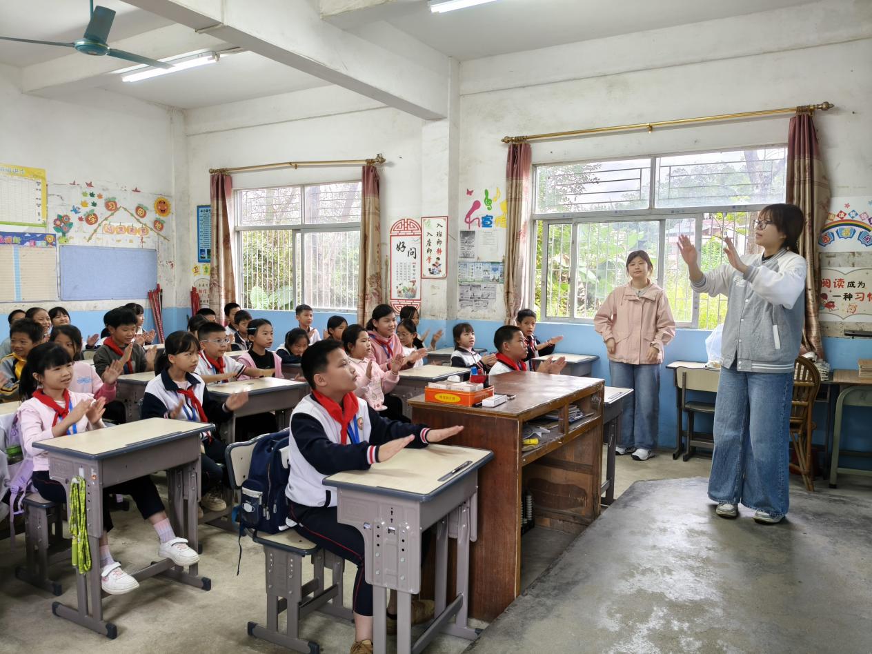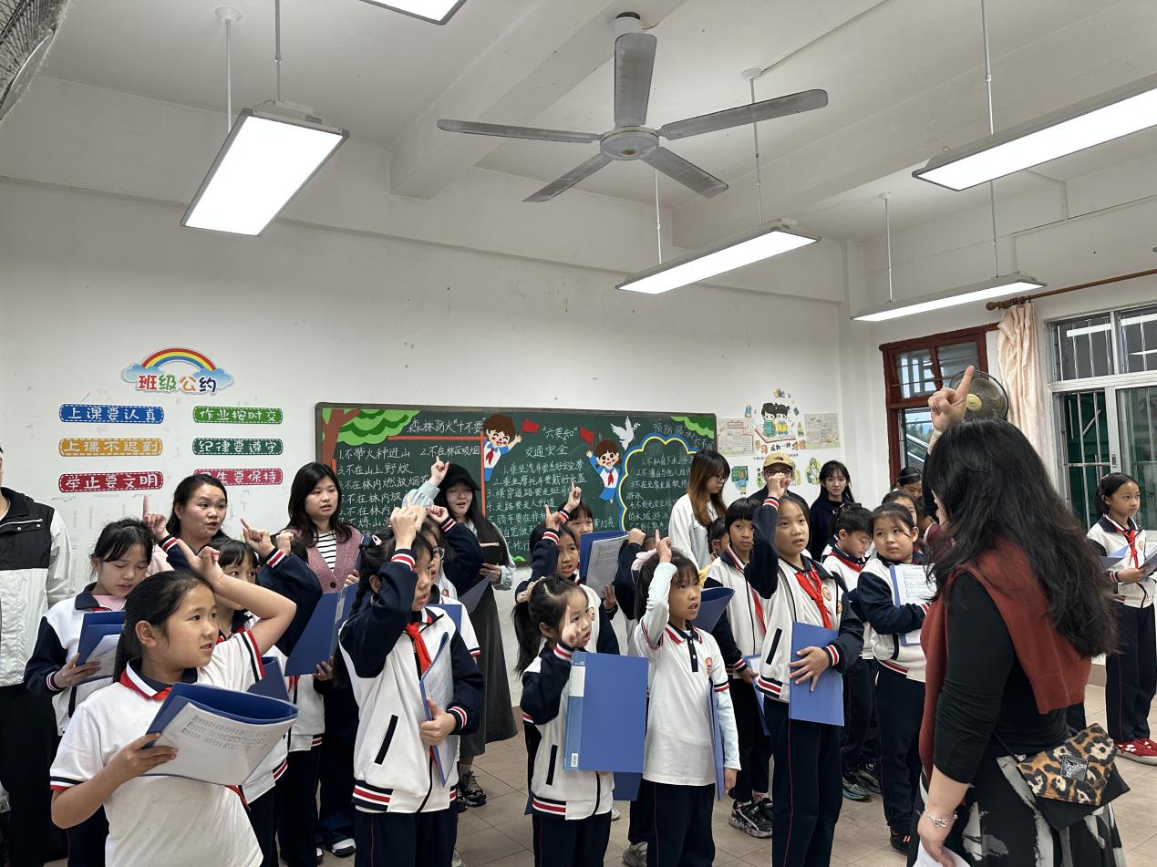 据悉,自11月9日起,华农美育浸润团队已先行在凤安镇中心小学、凤安中学开展为期一周的“送教下乡”美育实习。面对乡村学校硬件条件有限的客观条件,华农学子创新教学方式,以“学玩结合”为核心,将“音乐剧美育”融入课堂,运用奥尔夫教学法,引导学生通过拍手、肢体律动、节奏卡片等方式参与音乐活动,并结合《大鱼海棠》等影视内容进行情景教学,激发学生表达与创造的热情。原本腼腆的孩子逐渐乐于开口,自信地走上讲台展示成果。