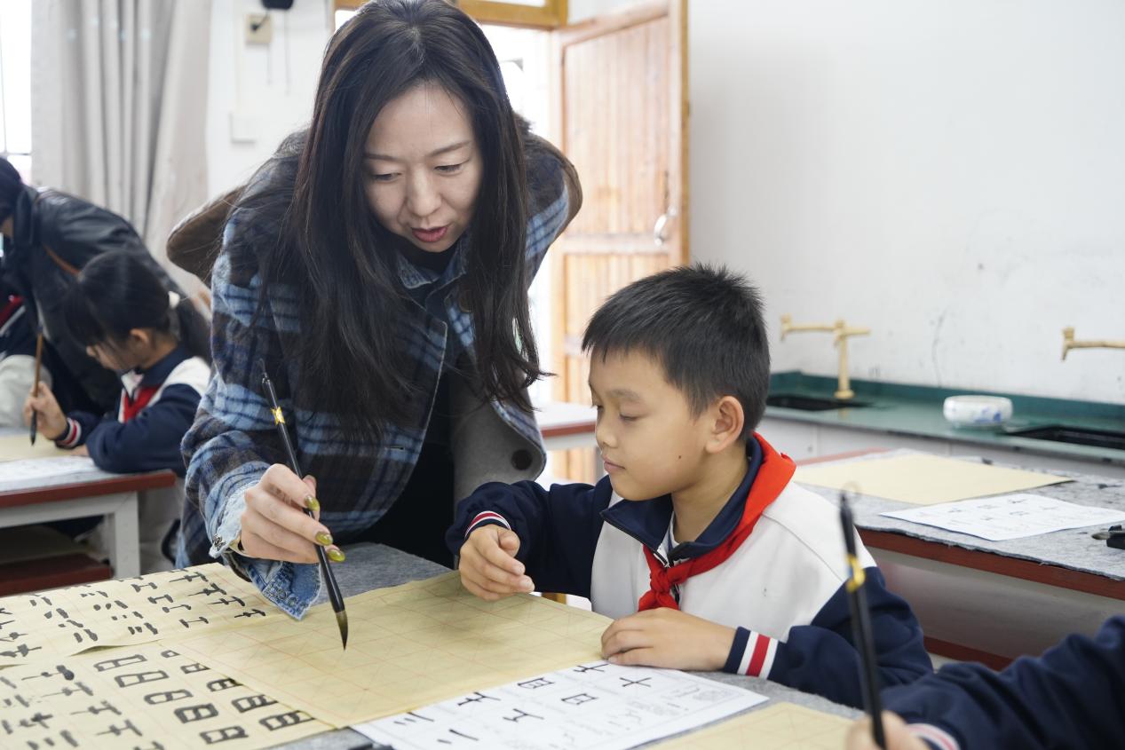 华农美育浸润团队罗梦达老师为学生提供书法指导