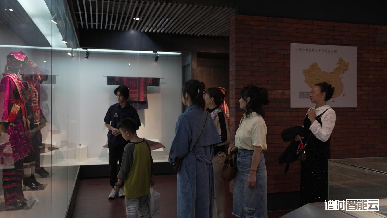 艺术学院美术馆当日推出“墨承古韵·壁绘新篇”特展,集中展出学院师生近年来创作的壁画与相关延展作品。展览在构图、材质和呈现方式上既延续传统笔墨意蕴,又融入数字影像、综合材料等当代艺术语言,展现了学院在传统文化当代表达方面的教学成果与创作实力。与此同时,民族服饰博物馆面向返校校友同步开放,学生宣讲员带领大家依次参观各类服饰藏品,从纹样工艺、地域风貌到民族礼俗,娓娓道来其背后的文化内涵,让校友在近距离观赏中感受中华优秀传统文化的多样与包容,也直观感受到学院在美育推广、文化传承中的平台作用。