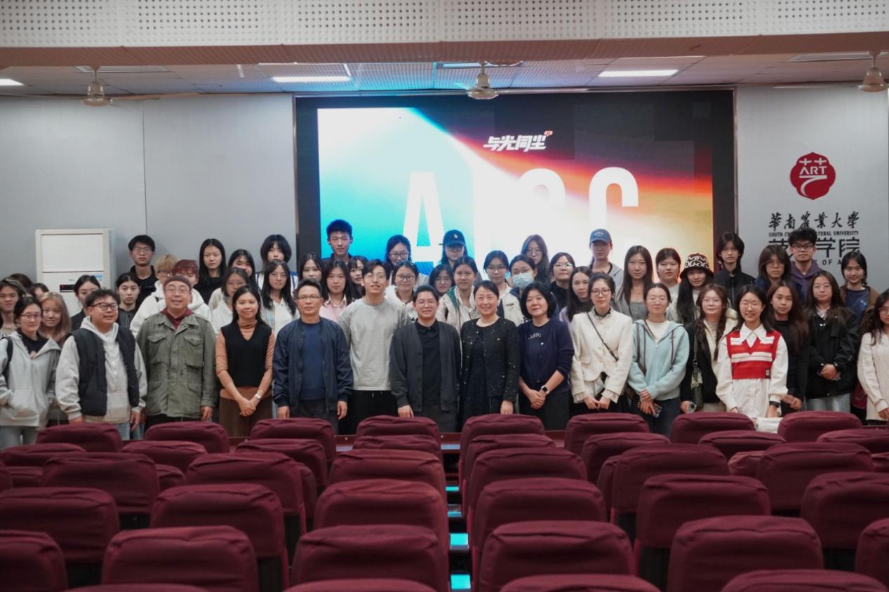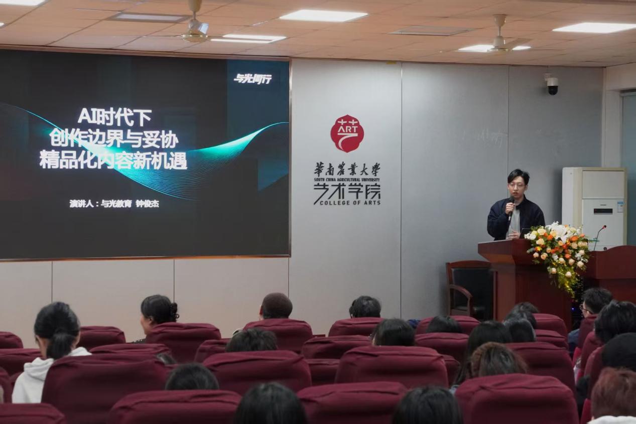 2025年11月26日晚,由华南农业大学艺术学院主办,传媒系承办的“技术赋能创意,解码数字时代新机遇”讲座在艺术学院501报告厅举行。本次活动邀请了与光同尘(广东)文化科技有限公司视觉总监钟俊杰担任主讲嘉宾,总经理陈炽亨到场交流。为华农学子剖析AIGC文化科技前沿,拓展数字内容创作视野。