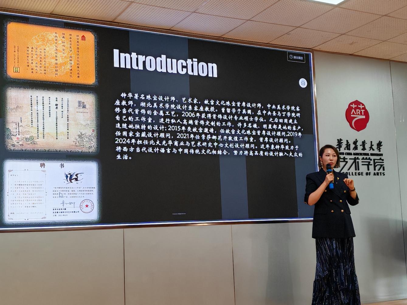 为拓宽学生专业视野、提升艺术审美与创新能力,12月5日下午,华南农业大学艺术学院特邀知名珠宝设计师、中央美术学院客座教授、故宫文化珠宝首席设计师、国家宝藏首席设计顾问钟华,在艺术学院501报告厅作“中国传统文化的灵感进阶之路”专题讲座。