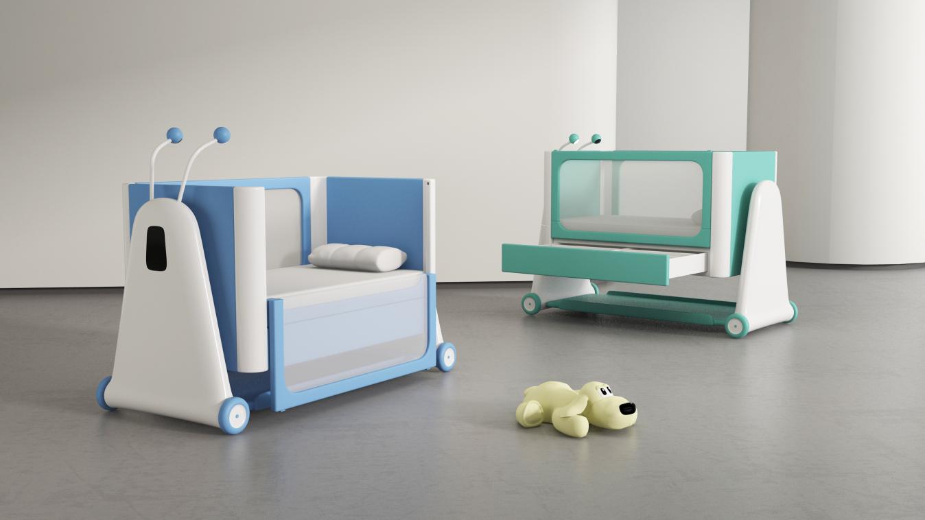 设计说明:本婴儿床设计以蜗牛为灵感,融合了自然美学与实用功能。床体在保证睡眠空间的前提下增添了大储物空间设计,两边的支架采用圆润的曲线设计,智能屏幕带有设置电动摇摆、调节床身、打开灯光和摄像头等功能,同时可通过手机APP远程操控。上方的摄像头与灯光仿佛蜗牛的两只触角,为宝宝的健康成长保驾护航。