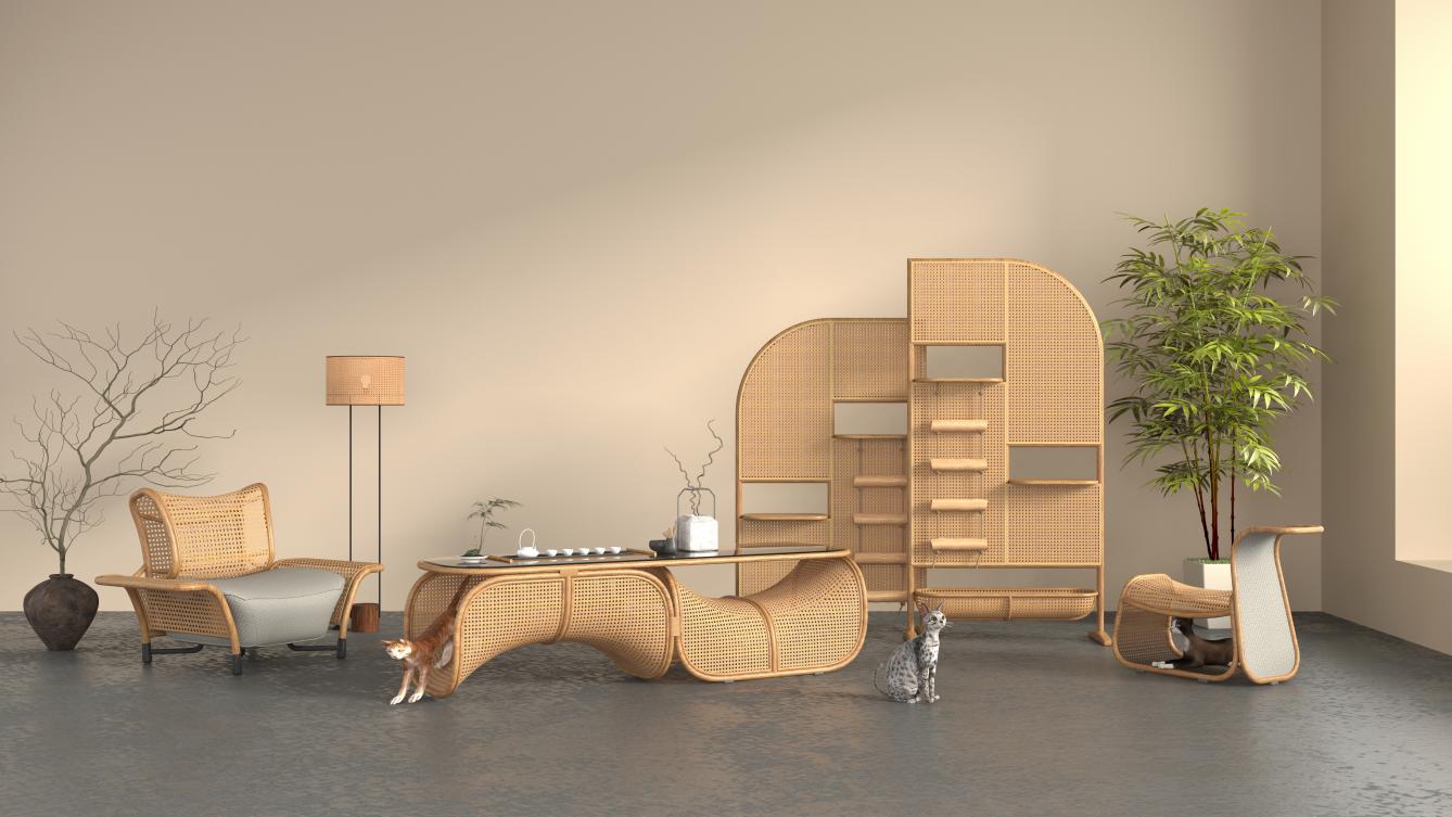 设计说明:本设计是一套人猫互动藤编家具,灵感来源于马鞍的造型。旨在提取马鞍优美的弧度融入人猫家具设计中,巧妙地解决了人猫家具中宠物猫的活动空间设计问题,例如茶几的底部设计由两个形状相同但方向相反的马鞍形部件组成,形成了一条非常适合宠物猫活动的隧道。材质选择天然藤条与塑料藤编的结合,同时融入猫抓板、玻璃、金属等材质。圆润的弧度设计与材质搭配不仅满足了宠物猫的爬、跳、钻、抓等需求,也满足了人的舒适度需求和情感需求。