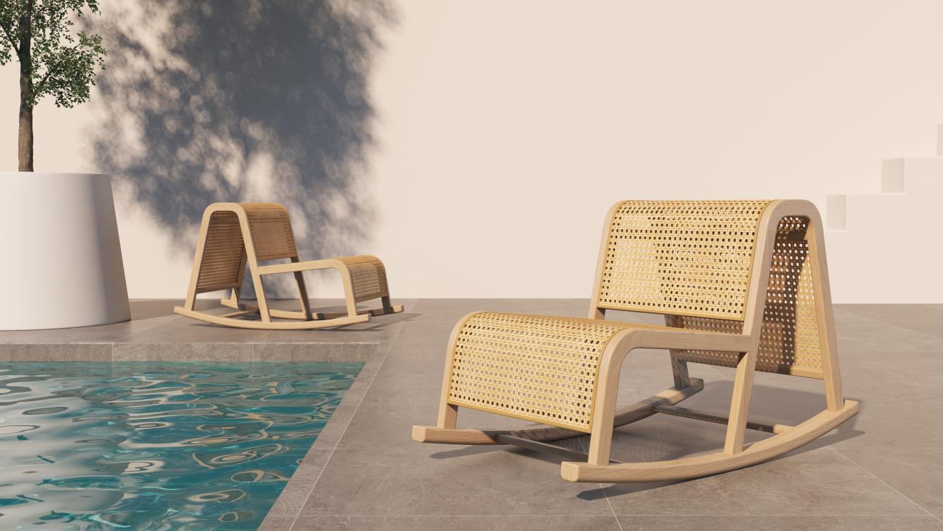 设计说明:本作品灵感源自中国传统"山"意象,融合自然元素与现代舒适。整体造型取山峦轮廓,线条刚劲。框架采用高支撑木材,座面与靠背运用八角藤编工艺,在保证功能性的同时,通过藤纹韵律展现山势肌理。宽大坐面配合精密计算的微摇弧度,营造山林沉浸体验,藤木材质摩擦声与支撑感共同唤醒自然禅意。