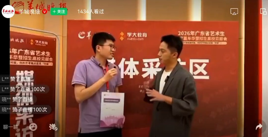 活动期间,林香润作为艺术学院代表接受羊城晚报直播专访,通过线上平台面向全省观众系统介绍艺术学院各专业方向、办学依托、培养特色及学生发展去向,重点解读艺术学院在服务国家战略、融入粤港澳大湾区建设、推动艺术与科技融合发展等方面的办学思路。通过直播互动,进一步扩大了艺术学院在艺术类考生群体中的影响力和辐射面。
