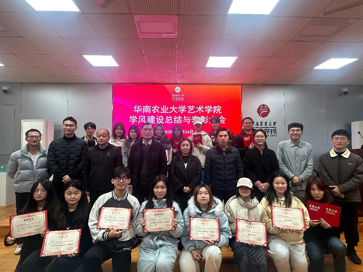 2025年12月26日,华南农业大学艺术学院召开2025年学风建设总结与表彰大会。大会以“以学铸艺,以风正行”为主题,学院党政领导班子、各系主任与专业负责人、全体辅导员、优秀班主任代表、获奖集体与个人代表、各班学习委员及学风建设委员会成员参会。