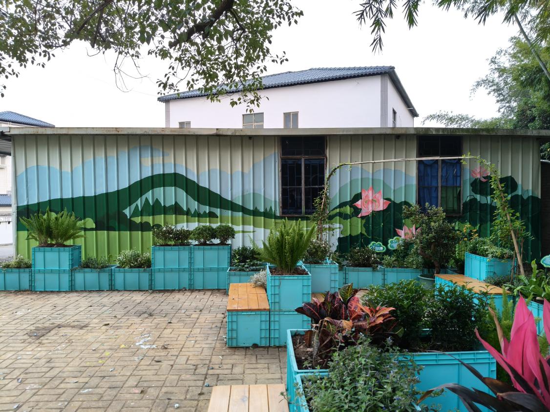 随后,团队在凤安镇完成两处墙绘。其中,仁里村沁香园墙绘围绕村落文化特色展开,以青山绿水为背景、以荷花为视觉核心,营造与周边环境相协调的乡村美育氛围;凤安镇中心幼儿园墙绘以“凤凰栖安处,客韵育新芽”为主题,结合幼儿教育特点,融入青山绿水、梧桐、凤凰、客家民居等意象,打造客家文化浸润下的校园艺术场景。