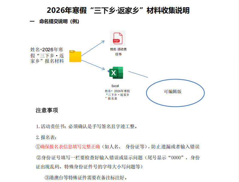2.提交材料。参与“政务实践和兼职锻炼”类别和“自主返母校招生宣传”类别的同学,确定开展“三下乡·返家乡”活动的具体内容后,于1月21日中午12:00前将《2026年华南农业大学寒假“三下乡·返家乡”社会实践活动信息汇总表》(附件2,可编辑版)、《安全承诺书》(附件3,签名PDF版)按下图指定方式发送至院团委邮箱:3161318589@qq.com