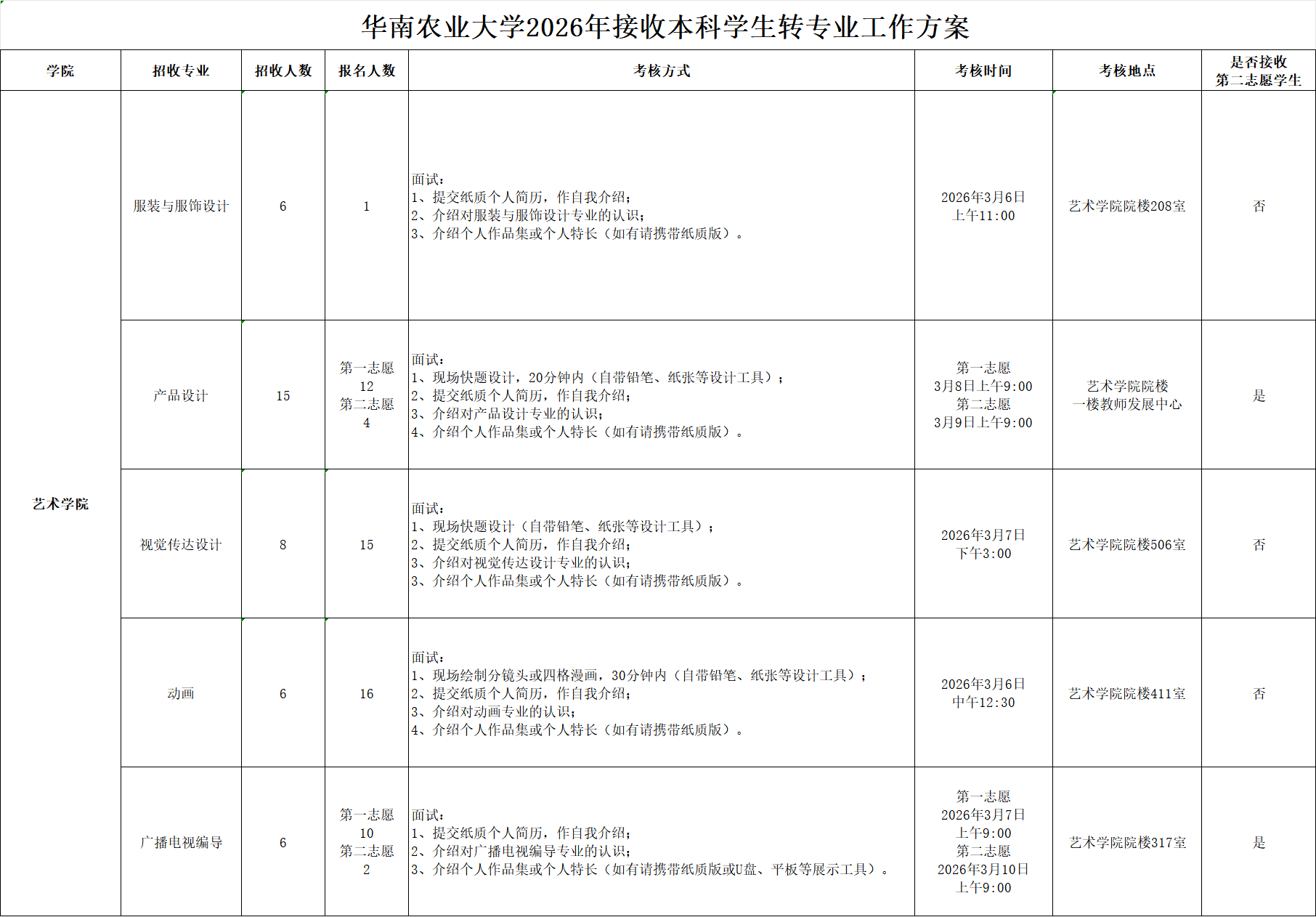为贯彻因材施教的教育原则,充分发展学生的个性,培养具有创新精神和实践能力的高级专门人才,学校允许本科学生在适当情况下调整原所学专业,转入新的专业学习。根据《华南农业大学本科学生转专业实施办法》(华南农办〔2021〕61号)的文件和华南农业大学本科生院发布的《关于做好2026年本科学生转专业报名与录取工作的通知》,现将艺术学院关于2026年本科学生转专业的有关事项通知如下: